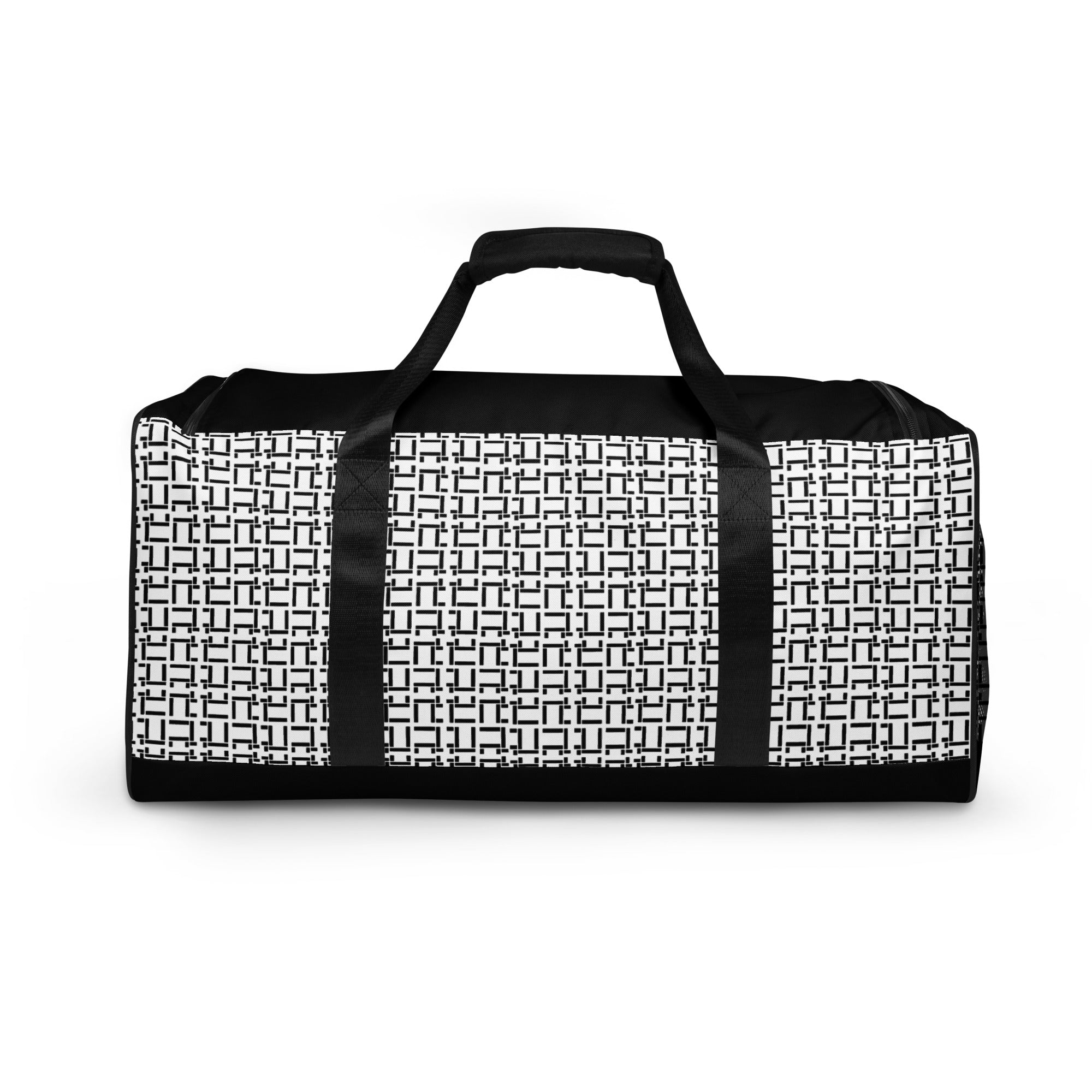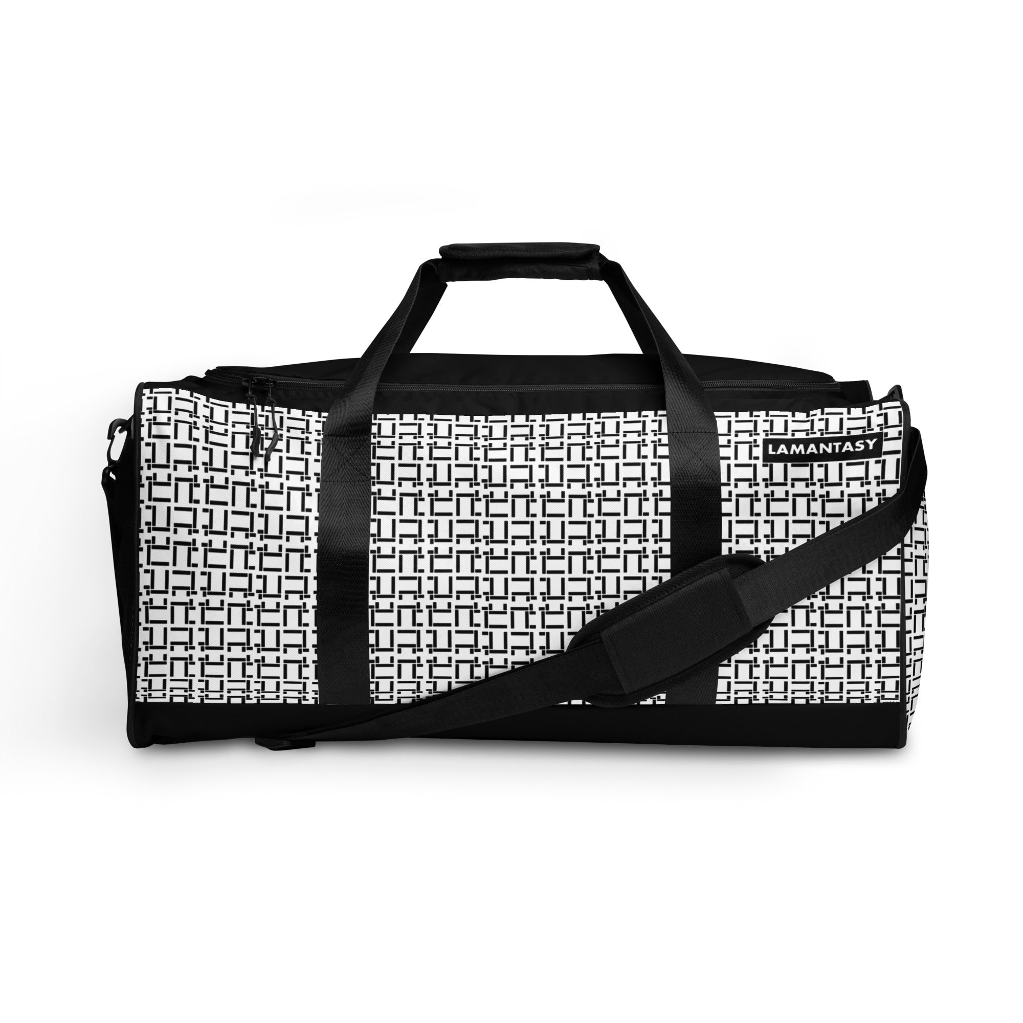 L LAMANTASY Black and White Duffle Bag. This printed duffle bag is your next stylish travel accessory for any occasion. Featuring our original elevated rare style.