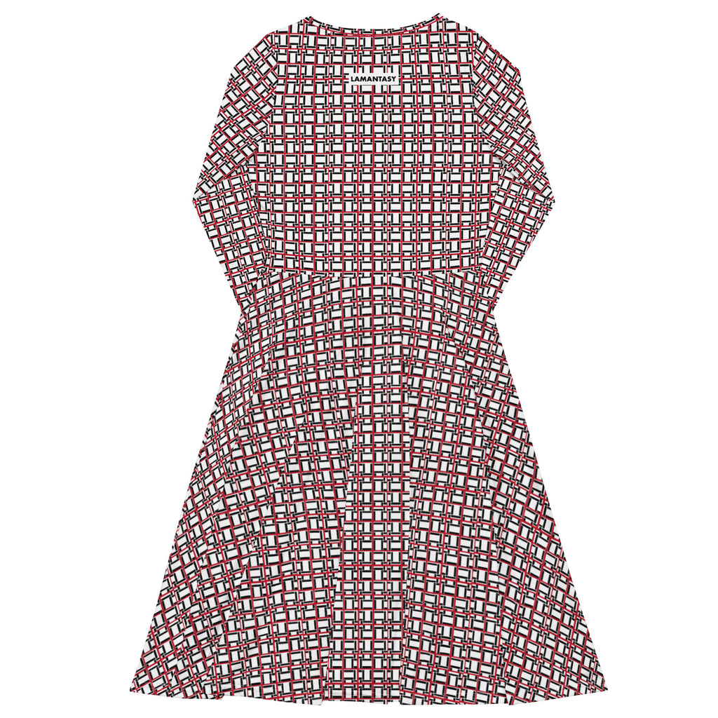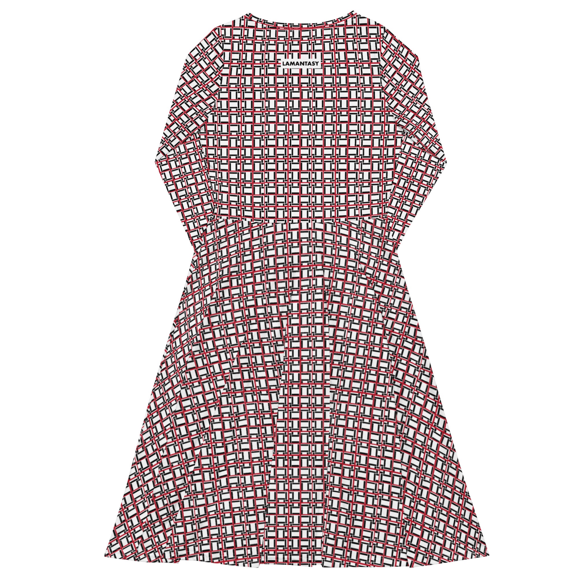 L LAMANTASY Red, Black and White Midi Dress. This printed dress is stylish, comfortable and versatile. Plus, there are two side pockets, with a fitted waist. Featuring our original elevated design.