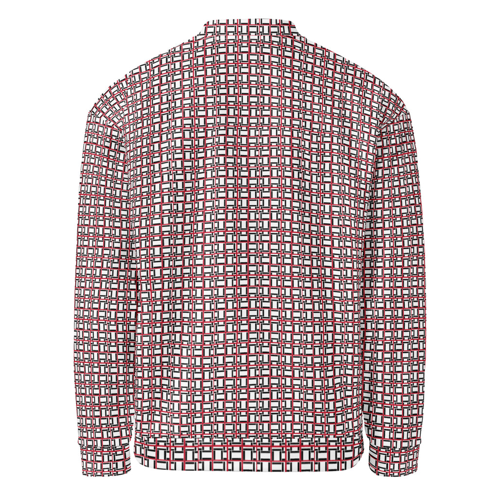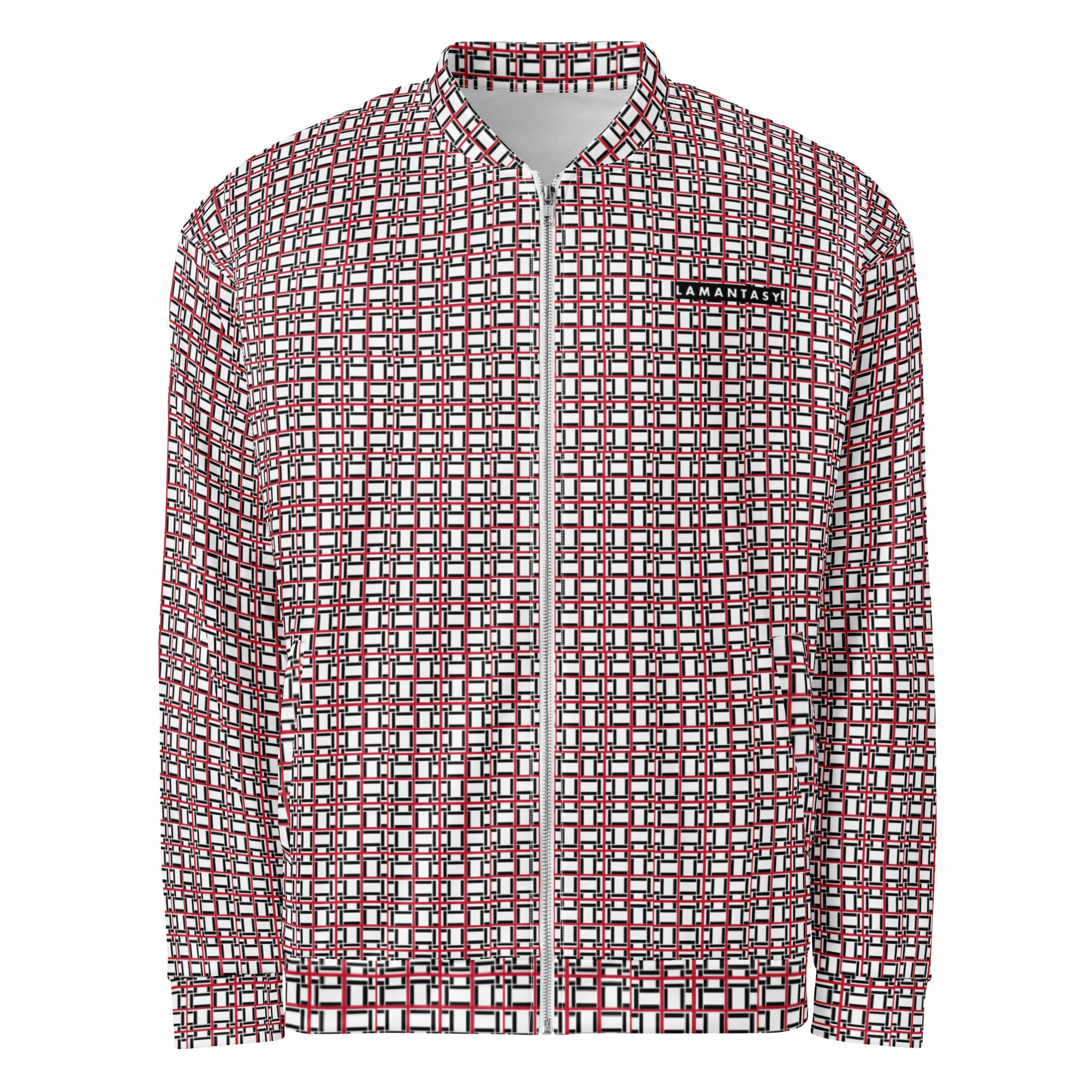 L LAMANTASY Red, Black and White Bomber Jacket. This printed jacket is stylish, comfortable and versatile. Plus, there are two side pockets, with a lightweight fit. Featuring our original elevated rare style.
