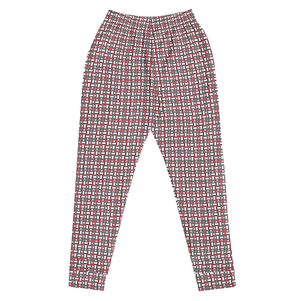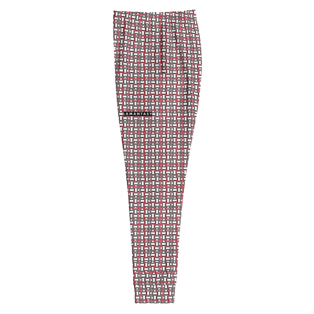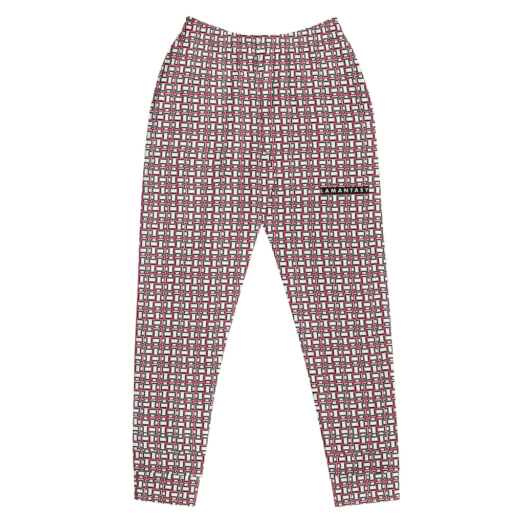 L LAMANTASY Red, Black and White Joggers. These printed joggers are stylish, comfortable and versatile. Plus, they are slim fit with two side pockets. Featuring our original elevated design.